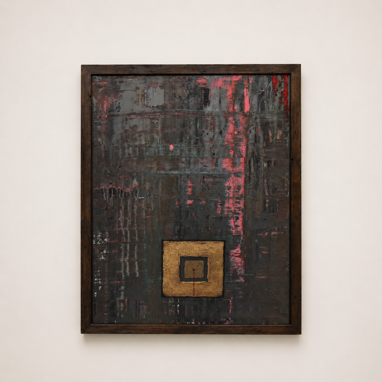 A soulful acrylic on canvas: part gestural abstraction and part quiet geometric mysticism – framed.